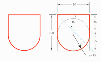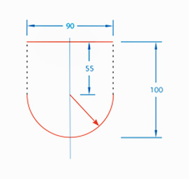 Espanjalainen kilpi – leveys 90 ja korkeus 100 yksikköä – syntyy piirtämällä ensin suorakaide ja sen sisään ympyrä, jonka säde on puolet suorakaiteen leveydestä. Kilven katkaisukohta (sininen vaakaviiva) on leveyden puolikkaan etäisyydellä suorakaiteen yläreunasta. Sininen katkoviiva rajaa suorakaiteesta neliön.