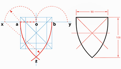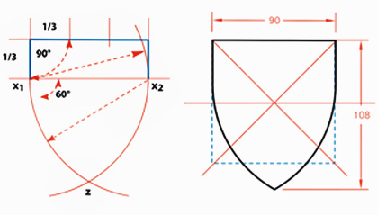 Erotetaan lakireunasta kolmannes ja siirretään mitta lakion sivuille. Jakopisteistä x1 ja x2 piirretään kilven leveys säteenä ympyrän kaaret kilven sivuiksi.