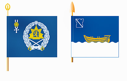 Valkoisessa vaakasuuntaan suorakaiteisessa lipussa aaltokoroinen sininen tyviö, josta nousee atrain saatteenaan irtonaisina kaksoispolviorsi tangonpuolella ja haaruristi liehuvanpuolella sekä Suomen leijona tangonpuoleisessa yläkulmassa, kaikki sinistä.