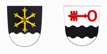 Hopeisella kilvellä punainen avain ja musta aaltokoroinen hirsi,