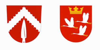 Punaisella kilvellä kolme lentävää hopeakurkea asetettuna oikealle suuntautuvan kärjen muotoon, kurkien varukset kultaa. Laessa kultakruunu.