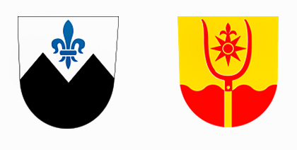 Kultaisella kilvellä punainen aaltokoroinen tyviö ja tyvestä työntyvä kaksipiikkinen vuorovärinen heinähanko, jonka piikkien välissä punainen kompassiruusu.
