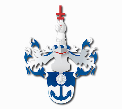 Sinisellä kilvellä hopeinen airo ja siihen kietoutunut kultainen käärme.Yhdessä omistajan kanssa.