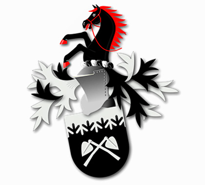 Mustalla kilvellä havukoroinen lakio ja kaksi kuokkaa ristissä, kaikki hopeaa.