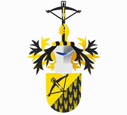 Kultaan ja mustaan vastalohkoisella kilvellä palkittainen korosta työntyvä jännitetty varsijousi nuolineen; jousi ja nuolenkärki mustaa, nuoli kultaa, sulat hopeaa. Alakenttä kultatähkillä kylvöinen.